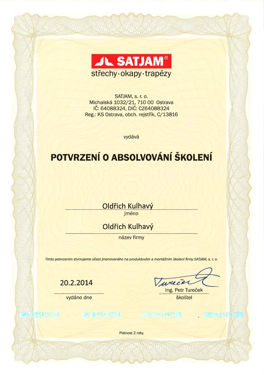 Potvrzení o absolvování produktového a montážního školení SATJAM s.r.o.